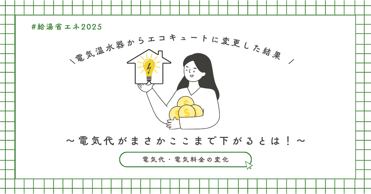 電気温水器からエコキュートへ変更するには初期費用がかかりますが、給湯省エネ2025事業を利用すると支払いが大幅に安くなり、変更後は電気の使用量も少なくなりました。昨今の電気代高騰がネックになっている方で電気温水器を使用されている方はわが家のように大幅に月々の電気代を安くすることが可能です。
